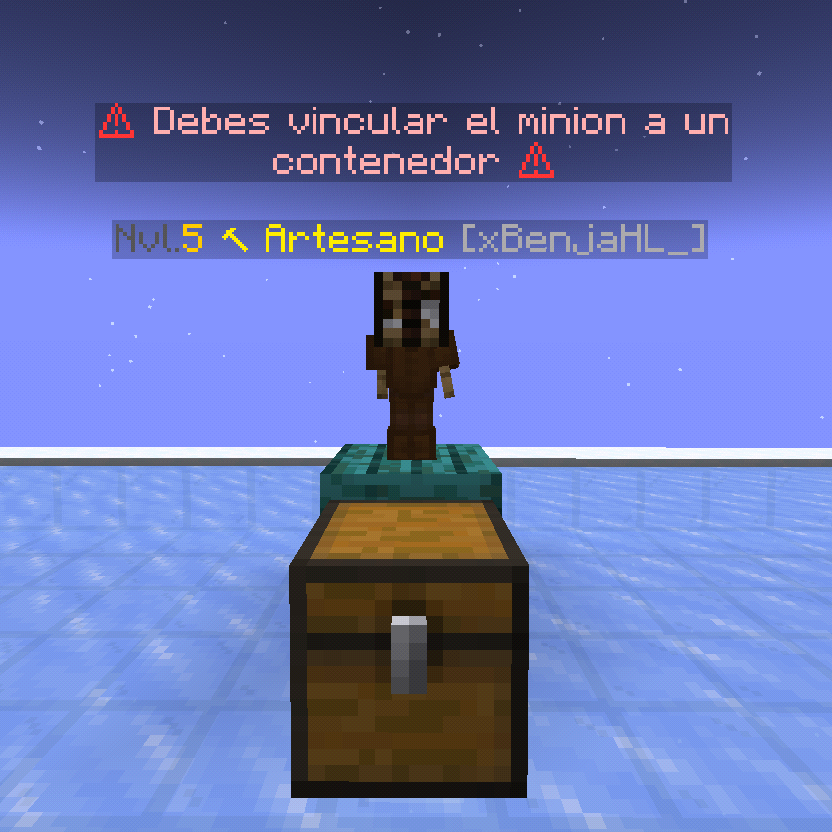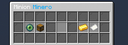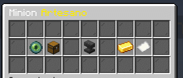 Minion Artesano: el minion artesano, para craftear nesecita el Item que ustedes quieren craftear, deben colocar el item en el menu del centro del minion, una ves el item colocado, vinculen primero el minion a un cofre cercano, y coloquen los items necesarios, que sea para craftear el item que ustedes quieren craftear Ejemplo: yo quiero craftear un yunque entonces le doy al Minion un Yunque, paso 2 colocan 3 bloques de hierro en el cofre y 4 lingotes de hierro, y eso generara otro yunque mas que seria de crafteo que yo le pedi que hiciera.
